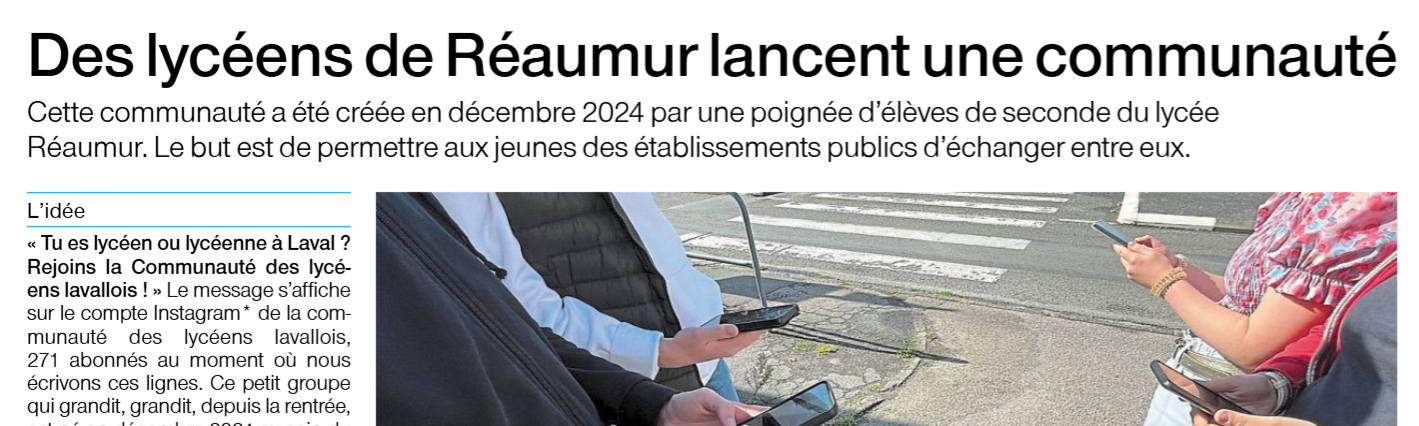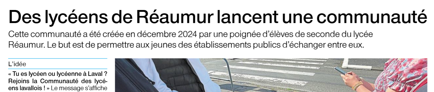 La communauté des Lycéens Lavallois est un espace d’échanges, d’entraide et de partage d’informations utiles, entièrement imaginé par et pour les élèves des différents lycées de Laval.